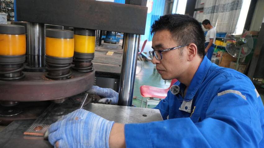 在抓好生产的同时,任中强还带领团队不断创新技术。工作中,任中强发现公司原先购买的铜母线压模设备只能小面积分段多次压模,不仅平整度不一致影响导电率,还影响生产效率。于是他和团队用一个多月的时间自主研制了一个母排自动检测校平压力机,优化了工艺流程,提升了电气产品生产效率和质量水平,并成功申报国家发明专利。任中强介绍,在这个模具上,可以将整体搭接面一次压平成型,压平后平面更平整,铜母线搭接无缝隙,导电率和导电效果都更好。