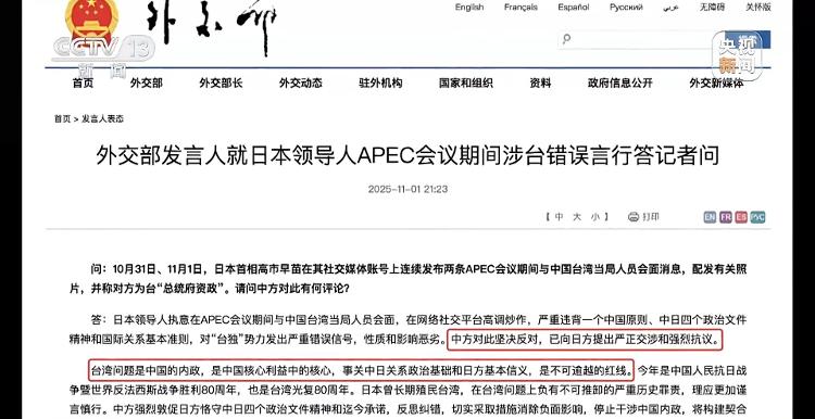 事实上,上任不到一个月,高市早苗就已经多次触及中国的红线。10月底的一场国际会议,她公然与中国台湾当局人员会面,并在社交媒体发布消息和照片。中方对此坚决反对,已向日方提出严正交涉和强烈抗议,并向日方表明,台湾问题是中国核心利益中的核心,事关中日关系政治基础和日方基本信义,是不可逾越的红线。